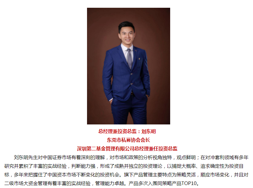 深圳第二基金管理有限公司由刘东杰先生、刘东明先生共同创立,成立于2014年,是一家综合性的资产管理与理财投资公司。作为首批获得私募牌照的中国证券投资基金业协会基金管理人,公司凭借多年来稳健的业绩获得了诸多荣誉,公司专注于筛选并统计各类二级市场标的物间的关联度并运用IT技术进行机会套利,在不确定的二级市场环境中捕捉确定性高的各品种套利机会。公司旗下产品线较为丰富,投资范围涵盖国内二级市场全标的物的混合型套利基金,自主管理的债券型基金、指数增强型基金、指数抗跌型基金、股票多头基金,还创立了几款可供资产管理人配置的工具型私募基金。
